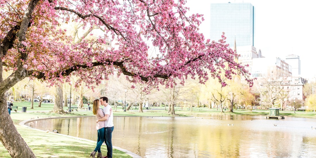 A few weeks ago, Brooke, Chris and I met up early on a Friday morning for their springtime Boston Public Garden engagement session. April was a cold one, and we weren’t sure if the flowers would be in bloom by the time the end of the month rolled around, so our fingers were crossed! Well, we definitely landed on Mother Nature’s side when we strolled around the park that morning. THOSE BLOOMS! It was sunny, and I don’t think it could have been better. Chris proposed to Brooke on the pathway next to the George Washington statue, and it was only fitting that we celebrated their engagement here. Their awesome black lab, Duke, came along for the ride – I love it when pups are in engagement photos! Perhaps the most memorable part of the engagement session was when Brooke and Chris were getting situated for a photo, and I offered to hold Duke’s leash. Well…Duke saw a few ducks and made a run for the water…and I couldn’t hang on so he was drenched. Oops! It certainly made for a great memory, and great photos. Duke, you are my spirit animal! Brooke and Chris, I can’t wait for your Hotel Marlowe wedding next September!
